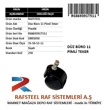 BÜRO İÇİN 11 PİMLİ TEKER RS869391T503; ofis koltukları, çalışma sandalyeleri ve hafif ofis mobilyalarında kullanılan standart 11 mm pimli (geçmeli) tekerlek tipidir. Genelde plastik gövdeli ve 360° döner yapıdadır.