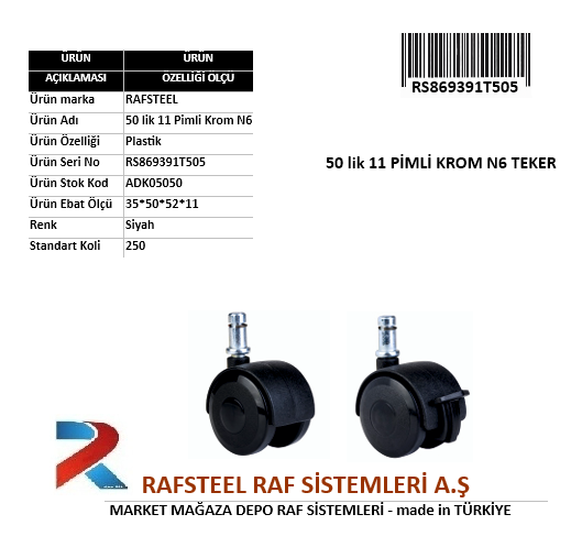 BÜRO İÇİN 50’lik KROM N6 11 PİMLİ TEKER RS869391T505; ofis koltukları ve büro mobilyalarında kullanılan, 50 mm çapında — krom kapaklı — N6 tip — 11 mm pimli (geçmeli) tekerlek modelidir. Şık görünüm ve standart ofis uyumu sunar.