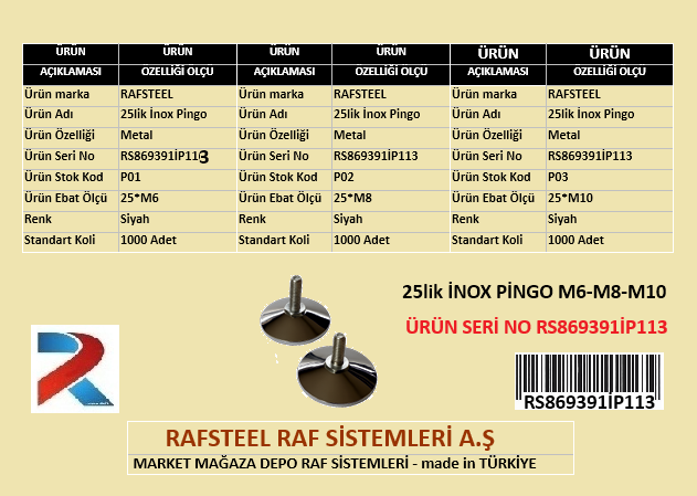 Rafsteel RS869391RT113 25’lik İnox Pingo, makine, profil ve ekipman ayaklarında yük dengeleme ve zemin ayarı yapmak için kullanılan paslanmaz çelik (inox) ayarlı ayak elemanıdır. tabanı sayesinde eğimli ve pürüzlü zeminlerde tam temas sağlayarak titreşimi azaltır ve stabiliteyi artırır. 25 mm taban çapı ile kompakt ve güçlü bir destek sunar.