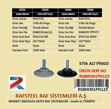 PLASTİK 57’lik ALT PİNGO RAFSTEEL RS869391PN123, raf ve metal mobilya sistemlerinde kullanılan **57 mm çapında geniş tabanlı alt pingo (alt ayak parçası)**dır. Genellikle ayarlı mil ile birlikte kullanılarak zemine temas eden destek yüzeyini oluşturur.