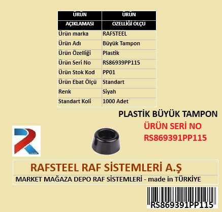 Rafsteel RS869391RT115 Plastik Büyük Tampon, darbe emici ve koruyucu amaçla kullanılan dayanıklı bir tampon elemanıdır. Çarpma ve sürtünme noktalarında yüzeyi korur, gürültüyü azaltır ve ekipmanların zarar görmesini önler. Büyük yapısı sayesinde geniş temas alanı oluşturarak etkili koruma sağlar.