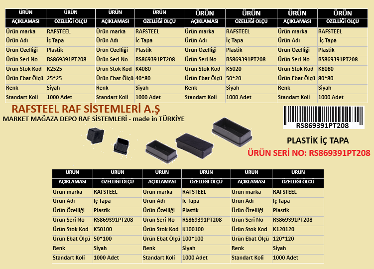 RAFSTEEL RS869391PT208 Plastik İç Tapa, metal profil ve boru uçlarını kapatmak için kullanılan koruyucu bir raf sistem parçasıdır. Özellikle çelik raf, mağaza ekipmanı ve metal konstrüksiyon uygulamalarında profil içlerine geçirilerek güvenli ve estetik bir bitiş sağlar.
