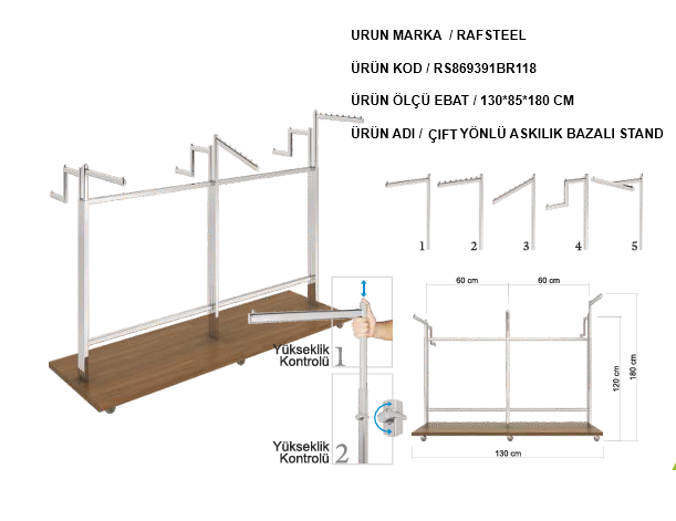 Çift Yönlü Askılık Bazalı Stand, mağazalarda kıyafet ve tekstil ürünlerinin iki taraflı olarak düzenli ve estetik şekilde sergilenmesini sağlayan profesyonel mağaza ekipmanlarından biridir. Çift yönlü tasarımı sayesinde aynı alanda daha fazla ürün sergileme imkânı sunarak mağaza içi alanın verimli kullanılmasına yardımcı olur.