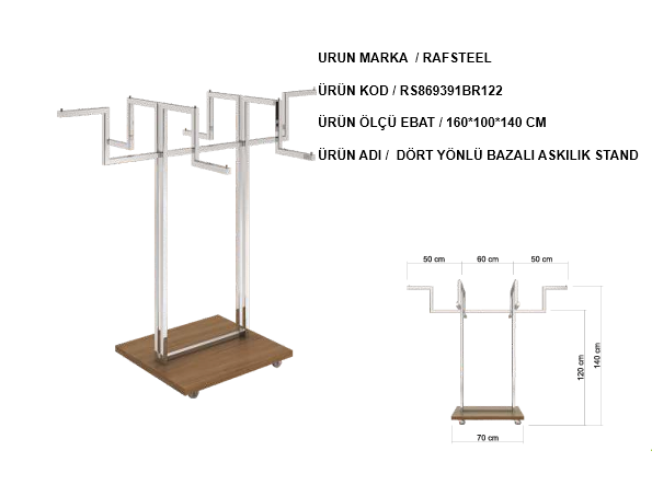 Dört yönlü askı tasarımı sayesinde mağaza içinde daha fazla ürünün aynı stand üzerinde sergilenmesine imkân tanır. Bu sayede hem alan tasarrufu sağlanır hem de müşterilerin ürünleri her açıdan rahatça incelemesi mümkün olur. Sağlam metal profil gövdesi ve dayanıklı tabanı sayesinde dengeli ve güvenli bir kullanım sunar.