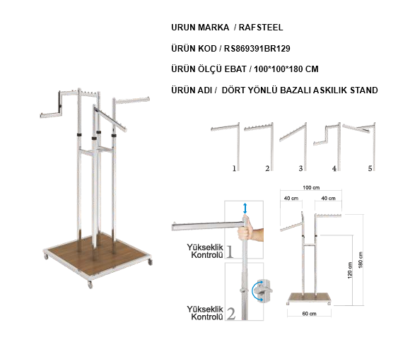 Dört yönlü askı tasarımı sayesinde mağaza içinde daha fazla ürünün aynı stand üzerinde sergilenmesine imkân tanır. Bu sayede hem alan tasarrufu sağlanır hem de müşterilerin ürünleri her açıdan rahatça incelemesi mümkün olur. Sağlam metal profil gövdesi ve dayanıklı tabanı sayesinde dengeli ve güvenli bir kullanım sunar.