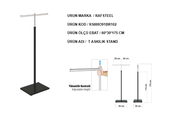 Düz Profil T Askılık Stand – RAFSTEEL RS869391RSA102, mağaza, butik ve showroomlarda ürünleri düzenli ve estetik şekilde sergilemek için tasarlanmış sağlam bir askılık sistemidir. Düz profil tasarımı ile sade ve modern bir görünüm sunar.