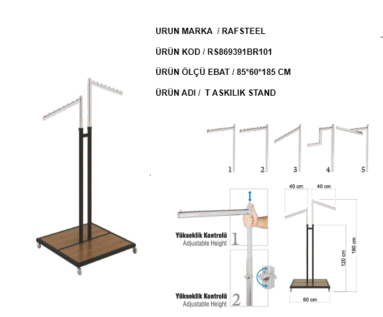 T formundaki askılık yapısı sayesinde kıyafetlerin düzenli ve dikkat çekici şekilde sergilenmesine yardımcı olur. Bazalı stand tasarımı, ürüne yüksek denge kazandırarak yoğun kullanım alanlarında güvenli kullanım imkânı sunar.