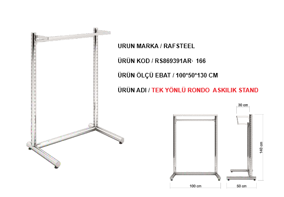 Tek Yönlü Askılık Stand, mağaza ve showroomlarda ürünlerin düzenli ve estetik şekilde sergilenmesini sağlayan pratik bir teşhir ekipmanıdır. Özellikle tekstil mağazalarında kıyafetlerin tek sıra halinde sergilenmesi için tercih edilir. Sağlam metal profilden üretilen yapısı sayesinde yüksek taşıma kapasitesine sahiptir ve uzun süreli kullanım sunar.